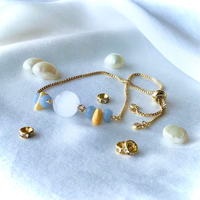【ファースト・ストーンシリーズ】 天然石ブレスレットを初めての方へ。 手に取りやすい価格でご提供。 初めてでも珍しい石をファーストストーンとして 身につけて、他とは差をつけてみませんか? ⌘ 天使@セレナイト&エンジェライト ⌘ セレナイトはセイレーン、エンジェライトはエンジェル 共に天使の名前を持つ天然石です。 (心身浄化・癒し・心の救済・ポジティブ) ジプサム(石膏)の中で無垢で透明なものだけがセレナイトと呼ばれます。とても美しいシラー(光沢)が入るのが神秘的で引き寄せられる石。 この天然石は浄化作用が強いとされ、主にはクラスターを持ち歩く方が多い天然石。 心の迷いや弱音を浄化してくれます。 エンジェライトもまた原石が最も美しい石。 小さなラッキーを拾ってくれる守護天使になってくれるようなエネルギーを持つ石です。 エンジェライトに合わせたアンバーは、 ハニーカラーのアンバーでとても甘そうで可愛いカラー 水に浮くことから、救済のノアの方舟のような石です。 付けるだけで、天使に守ってもらえるような、 癒されるファーストストーンブレスレットです ※注意※ ・セレナイト・エンジェライト共に硬度の低い柔らかい石です。取り扱いにご注意下さい。 ・セレナイトは水を吸収してしまう性質の石なので、浄化したい場合は月光浴か、クリスタルクラスターまたは、チップに置く事をお薦めします。