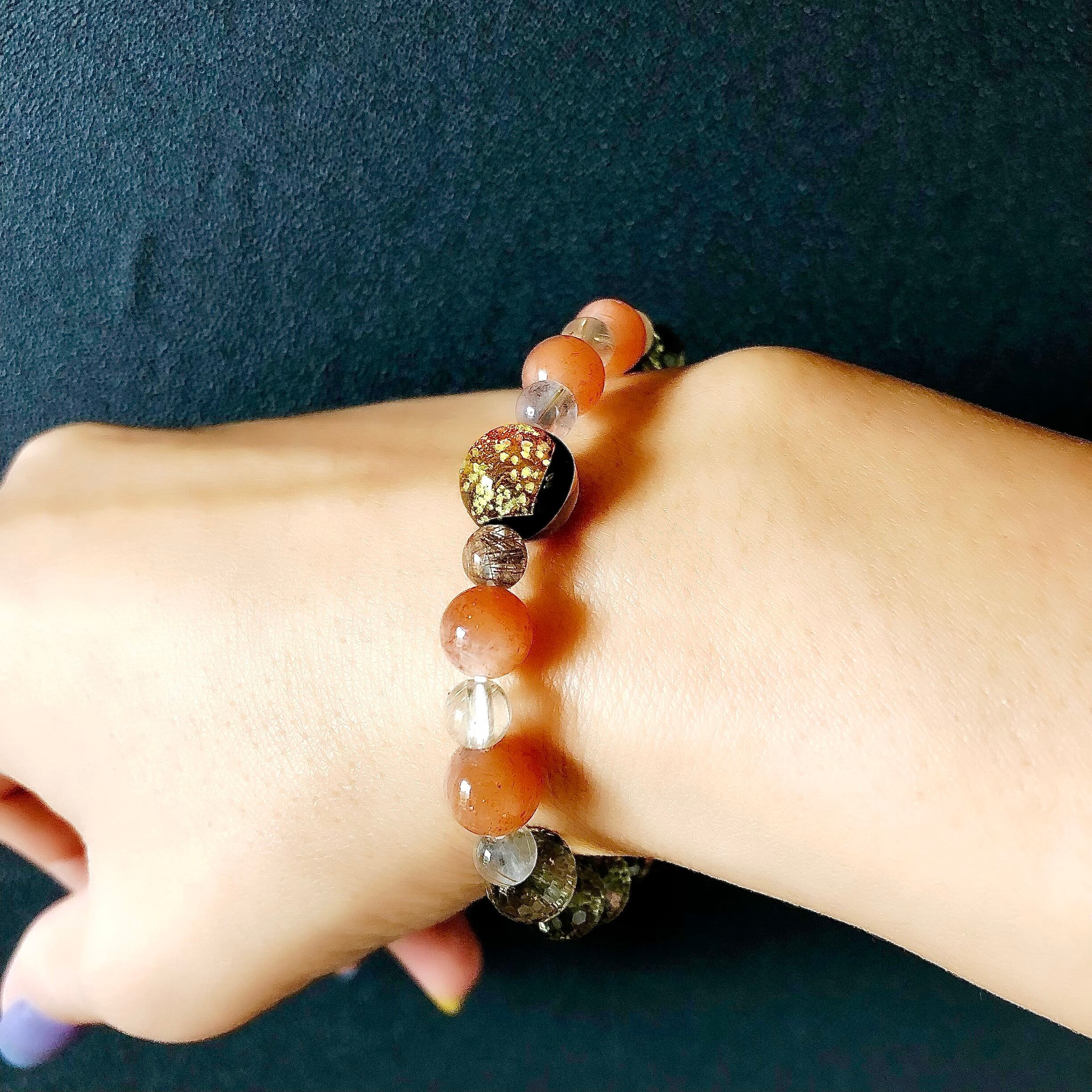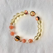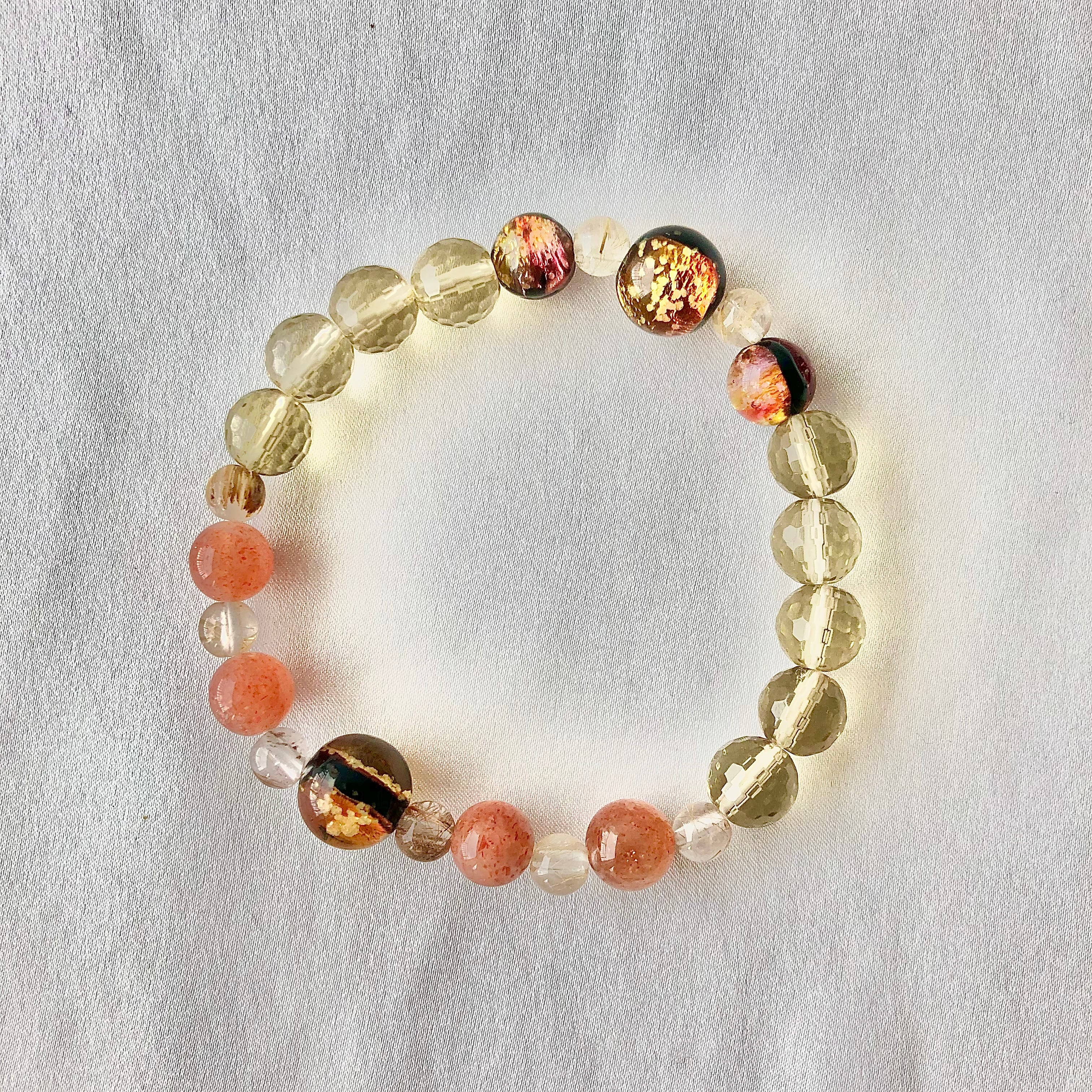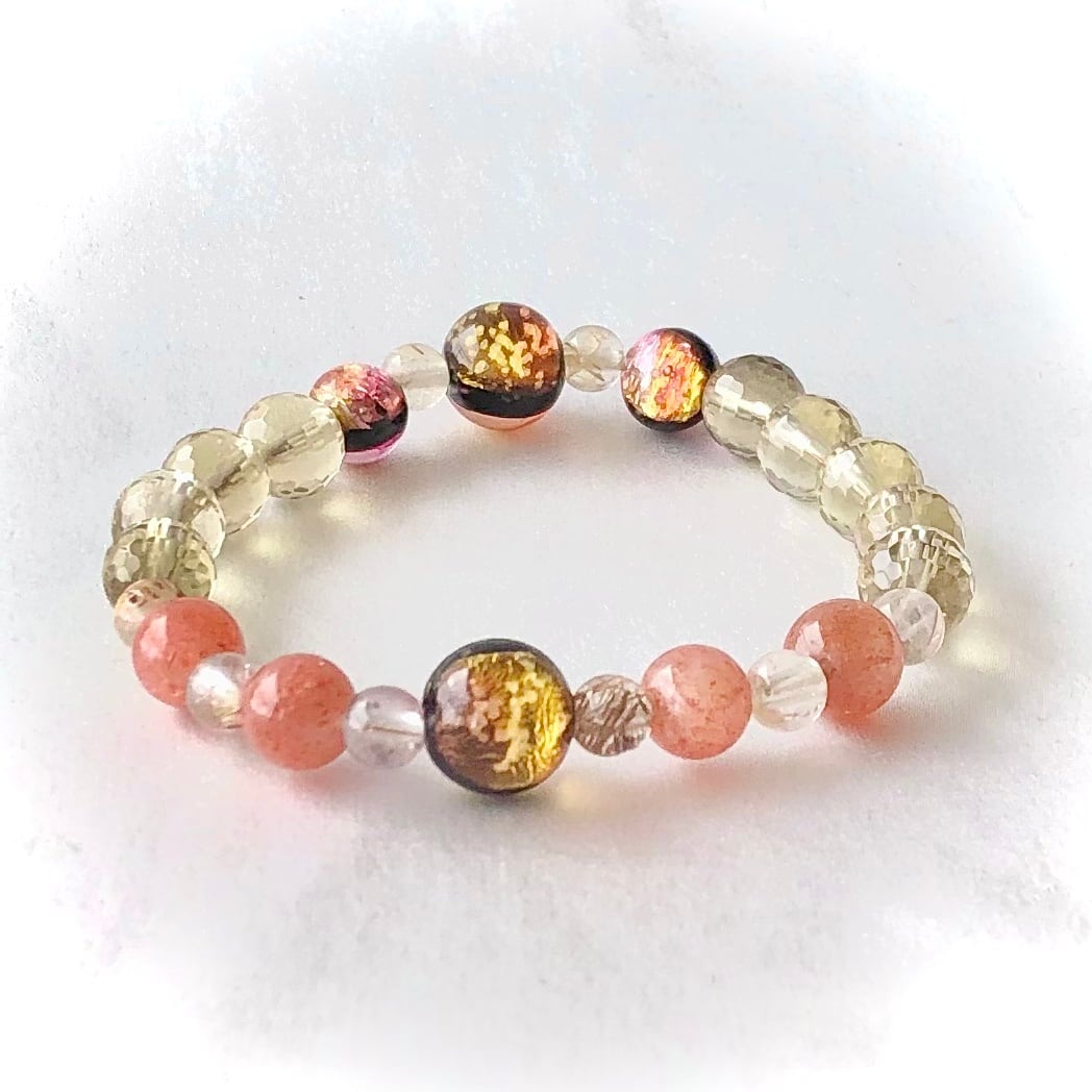「太陽石」とも呼ばれるサンストーンをメインに火のエネルギーに溢れ、守護してくれるような力強いエネルギーを受け取れる、夏を閉じ込めたような強いブレスレットです。
